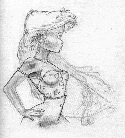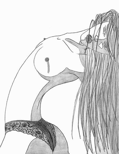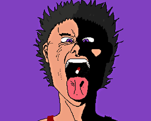 Le jour même où je rédigerai ce texte, je ferai un dessin plutôt évocateur (à vrai dire je ne me rappelle plus qui vit le jour en premier, la prose ou l'esquisse). Une Langue pendouillante et baveuse, des cheveux hérissés par la folie, un regard convulsé qui exprime la toxicophilie et, postée en équilibre sur cette lavette, face à cette contorsion infantile, une femme, intégralement nue, doigt levé en signe d'autorité, soutient sous sons bras gauche une pilule.