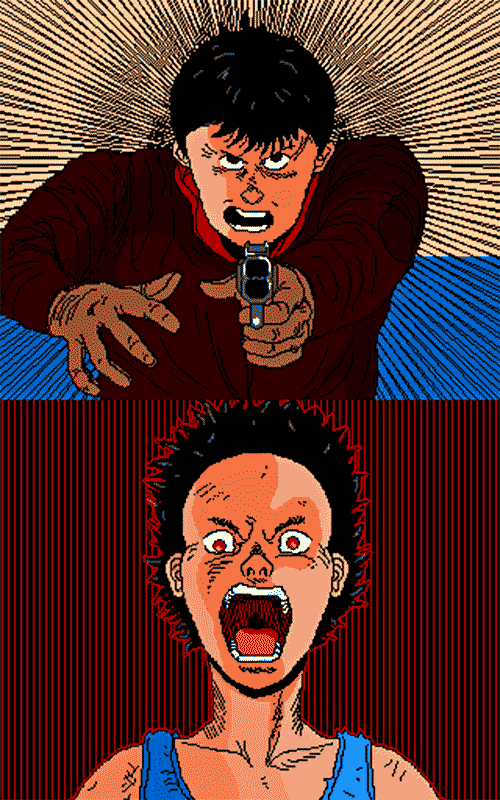Les semaines se dissipent, je ne me souviens guère, mais j'avais dû passer le Bac de français, surement en attente des résultats, et je traine mes savates dans une librairie, à la recherche de je ne sais quel magazine. Mon regard se porte alors intuitivement sur la couverture d'une bande dessinée, aux dominantes rouges et bleues plutôt bien prononcées : AKIRA. Ça alors ! Des séries animées nippones diffusées sur les chaines françaises : OK ; un long métrage japonais projeté sur grand écran : ça venait de se produire ; mais des bandes dessinées japonaises distribuées dans les kiosques français : inimaginable ! D'un prix de 18 francs, ce volume d'une soixantaine de pages est le numéro 19 de la série, je l'achète, et m'empresse de le lire. Néo Tokyo vient d'être détruite, Tetsuo et Akira commencent leur éclectique symbiose, c'est la panique dans les décombres à la recherche de deux mutants, et Miyako est sur le point de faire son discours métaphysico-scientifique : c'est claire, je n’ai rien pané à l'histoire ; mais l'envoutement est d'une immédiateté déconcertante. Tel un psychotrope, la finesse du tracé, la profusion du détail, la justesse des formes et leur superfluité apocalyptique m'immergent dans une accoutumance sans limites. Le déchainement visuel d'Akira, la BD, provoque en mon sein une succession d'artefacts violents et sismothérapiques, dont la récursivité englobe mes pupilles d'un halo enfiévrant : me voilà drogué par la limpidité scripturaire de maître Otomo.
