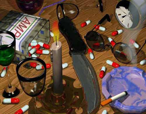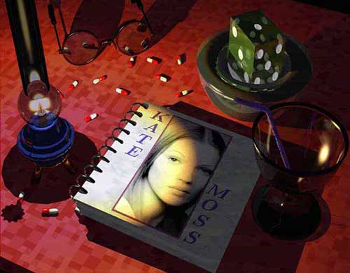 Amphétamine n'existe plus, je ne fais plus de Slide ni de démo, le monde de l'Amiga est en déclin (même si c'est sur cette machine que j'ébauche mes créations), mais je continue sans relâche mes délires scripturaux : dessins à l'encre noire afin d'épurer mon trait, et rendu d'images modélisées sous Imagine. Et de temps à autre, sur quelques-unes de mes images 3D, apparaissent les pilules, de façon succincte mais efficiente, comme un hommage ou une réminiscence d'un passé ma foi tout proche. On remarque aussi la présence d'une paire de lunettes, ronde et noire, qui le plus souvent reflète ces mêmes pilules. Cette paire de lunettes est une marque de ma présence, au sens physique du terme, elle « enforme » mon être dans son intégralité, mais ne le déforme point, même dans sa fractionnalité.