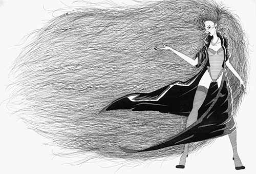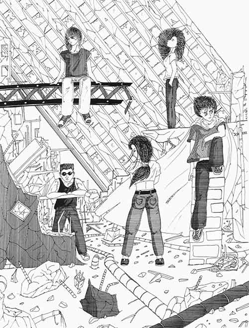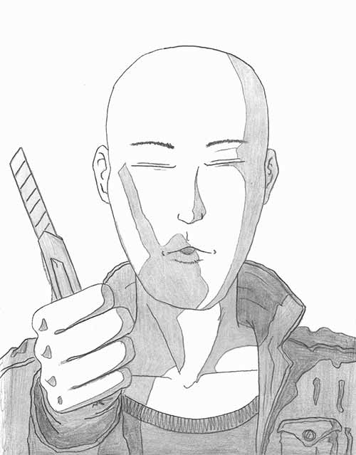 Mais comme je le disais, je dessine aussi, et c'est clairement durant ces années folles que je vais perfectionner mon style, et le faire mien. Je n'use que du noir et blanc, l'encre provient de mon jeu de Rotring que je m'étais offert et le support est un papier canson au format A3, voir A4. J'élabore une esquisse préliminaire au HB, et noircit le tout afin de donner vie à l’œuvre. Mais l'extase survient durant la troisième étape de l'élaboration : le tramage. Cette dernière partie consiste à tracer des lignes à la règle, parallèles, plus ou moins espacées (de 1 voir ½ millimètre), afin de définir les différentes tonalités et de jouer avec les ombres. Cette étape me demandait un effort, une concentration, une assiduité hors du commun ; mais indirectement, cette indéfectibilité de mon acharnement m'embourbait dans une transe qui ne trouvait fin que lors du traçage de la dernière ligne. Durant ces instants, j'étais comme magnétisé par ce parallélisme infini, les douleurs qui me survenaient à l'épaule, à l'avant-bras ou au poignet ne pouvaient contrecarrer cette frénésie. Je traçais, et traçais encore ces lignes endiablées qui donneront le cachet final à mes illustrations.