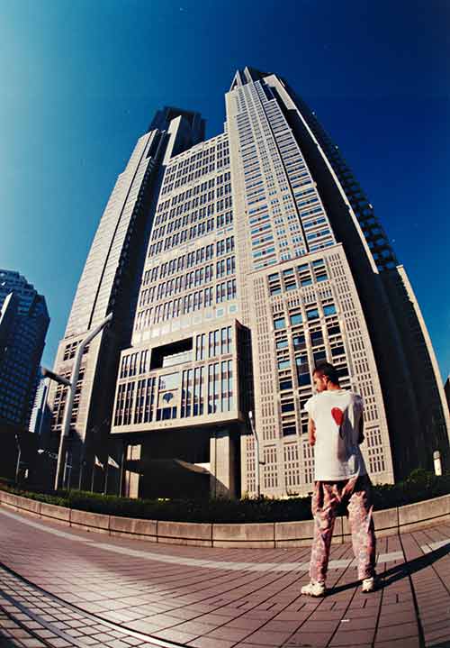 Mais 1997 est aussi l'année où je me lance dans les voyages, Sénégal en mars, pour une visite familiale, mais surtout Japon, en septembre octobre : comme un rêve qui semblait se concrétiser. Durant ce séjour de 6 semaines, je déambule essentiellement dans les ruelles de Tokyo, mais ferai le tour de Honshu, et mon passage par Hiroshima me changera à tout jamais. Noyé, au petit matin, au cœur même du parc de la Paix, mes pupilles s’immisceront vers le halo atomique, envoutées par la sonate monorythmique de l'horloge de la paix qui engendra pour toujours l'arrêt, prématuré et éternel, de mon horloge biologique : je ne vieillirai plus à partir de ce jeudi, condamné à rester jeune et fragile, à errer dans une candeur des plus déstabilisante. Je resterai donc jeune toute ma vie durant, jeune et innocent, jeune et fragile, jeune et puéril, jeune et irresponsable, jeune et pusillanime, jeune et stupide peut être, mais je resterai jeune toute ma vie, car à l'aube d'un jeudi 25 septembre 1997 (j'ai alors 23 ans), l'horloge de la Paix fissura de sa musicalité mon unique tympan fonctionnel et me fit prendre conscience de mon humanité, éternelle elle: Merci Hiroshima, merci HIROSHIMA. Mais le temps poursuit sa mouvance et je suis toujours au Japon, et, subjugué par la frénésie photographique, je mitraille sans compter, je pratique, expérimente, je m'autoportraitise aussi, et poursuit mon délire commencé au Sénégal, où je me mets en scène face à une entité incommensurable, dos à l'appareil, avec mon T-shirt possédant une pilule (amphétamine toujours) peinte sur le dos. Si au Sénégal, c'était face à un Baobab que je m'étais planté, à Tokyo, c'est face au Métropolitan de Kenzo Tange que je me poste (je remarque maintenant que je n'avais même pas mes petites lunettes rondes et noires sur le nez) ; et je me posterai face au Walace Monument en Écosse, face au site de Palanque au Mexique, face au Perito Moreno en Argentine, face à Iguazu au Brésil, face à La Paz en Bolivie.... mais je m'éloigne, bien expéditivement.
