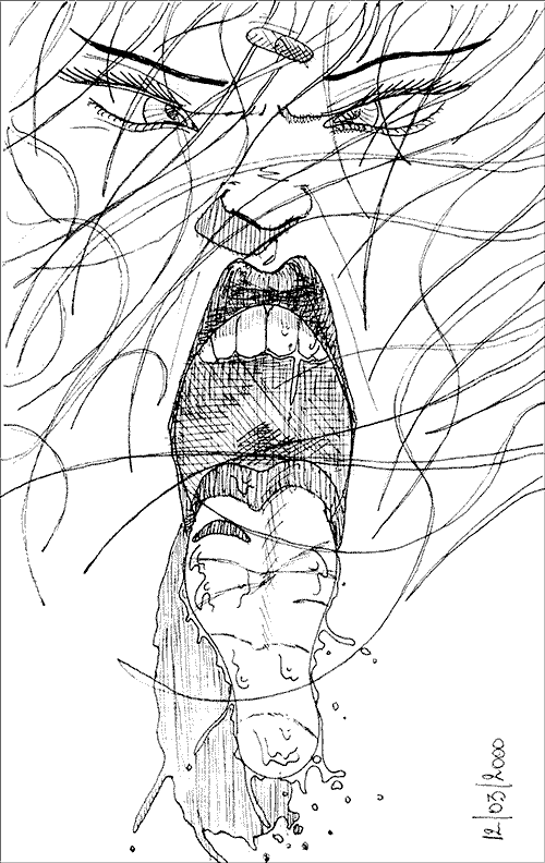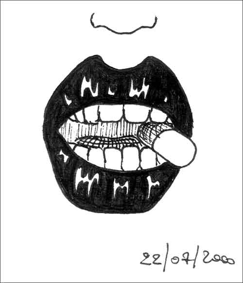 L'amphétamine tourne donc toujours dans ma petite tête, même si je ne la dessinerai que très peu, voir pas du tout par la suite. Pas tout à fait en fait, car à Potosi, en plein mois de juillet, bien posté au chaud dans un bar, j'esquisserai de nouveau la granule. Coincée entre les dents d'une bouche féminine aux lèvres pulpeuses, l'amphétamine semble fournir ici l'assurance que procurerait un cigare dans la gueule d'un mafieux. Ce dessin, au clair obscur évident, est d'une grande simplicité, mais aussi d'une grande efficacité. Inutile de vous cacher qu'il est directement tiré d'un souvenir loin d'être enfoui. Lors de la sortie du film Akira au Japon, en 1988, des posters avaient été imprimés pour promouvoir sa prompte projection. Sur l'un d'eux, trois belles Japonaises, en maillot de bain et vues de haut, étaient assises sur un patchwork d'illustrations dont l'une d'elles était une bouche féminine mordillant le fameux comprimé. Perdu aux abords des hauts plateaux, sur la ville la plus haute de Bolivie, enivré par les vents virulents de la Cordillère des Andes, l'univers d'Akira reste continuellement ancré dans mes méninges, et ce dessin en est la preuve. Lors de la rédaction de mon récit de voyage, que j'écrirai à mon retour, je laisserai cette épitaphe pour commenter ce même croquis : « il faut attendre le soir du 22 juillet 2000, après mon arrivée à Potosi, pour qu'enfin j'élabore ce dessin phare. L'inspiration est directement issue de ma muse ; cependant, il reste le symbole de tout un délire, de toute une histoire même... » Qui l’eut cru, je suis, en ce moment même, en train d'écrire cette histoire.