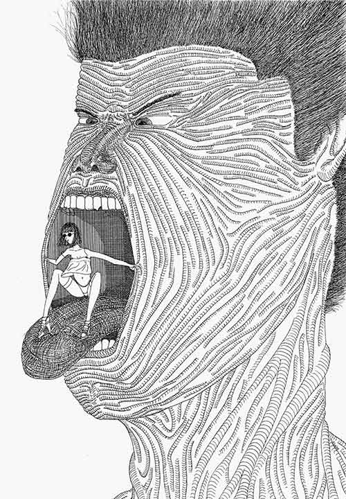 1998 sera aussi une année fort productive en ébauche d'illustrations, je m’adonnerais au grand format, 75x50, sans capsule, mais plus que jamais composée de lignes parallèles, concentriques, et frénétiques. L'indéfinissabilité (en mars), Révélation (toujours en mars), Mécanisation (en avril), Duel (encore en avril), Espérer la Paix (toujours en avril), Populaire (en aout), Délivrance (aussi en aout).... tels seront la prémisse des titres que je leur donnerai. Mais le dernier cité est très intéressant, il montre une femme, en lingerie fine, postée sur la langue d'un homme totalement convulsé. La langue pendante est bien présente, mais non pour accueillir une amphétamine cette fois-ci, sinon pour guider vers une sortie. Car la position de la demoiselle, couverte des ses petites lunettes noires et rondes, ne trompe pas, elle se dirige clairement vers l’extérieur, vers une délivrance. Mais qui se délivre de qui? Ou de quoi? L’ambiguïté est évidente: les convulsions aussi nécessitent une délivrance. Mais là n'est pas la question, toute l'importance de cette illustration repose sur l'orientation. Si jadis la langue permettait l’immixtion d'un comprimé afin de stimuler l'activité cérébrale, cette fois-ci, elle se transforme en un plongeoir et offre une échappée à cette même activité. Conclusion évidente: la môme n'est pas une métaphore de l'amphétamine; et même si je l'écris maintenant sans inquiétude, à l'époque où j’esquissai cette œuvre, je n'en savais absolument rien!