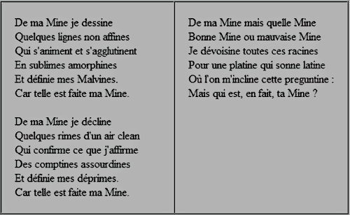 Ici, l'amphétamine n'est pas directement présente, mais elle se fait sentir au travers d'un jeu de mots, d'un jeu de lettre, qui nous plonge dans la dualité. Deux mines, à l'apparence identique, commensurable, semblable, autant homonymique qu'homophonique, suivent une gestuelle maîtresse commune, mais se perdent dans une finalité non opposée, sinon coplanaire. L'amphétamine introduit donc, par cette rime simpliste et crédule, la symbiose d'une entité à la fois double et invariante, génitrice d'un tracé dyadique qui donnera forme à deux expressions distinctes, mais au fond si contigu que leur union fusionnelle ne pourra se rompre : uni telles les deux parties de la capsule rouge et blanche. L'épistolaire coudoie donc l'illustratif dans une coalescence harmonieuse et délicate où les mines divergentes tracent, dans un parallélisme immuable, des œuvres à la fois sécantes et complémentaires. Mais qui est en fait ta mine ? L'amphétamine ne serait-elle pas le moteur de tout ça ? Admixtion vaporeuse et insouciante de cordons synaptiques et apexiens ? L'histoire le dira...