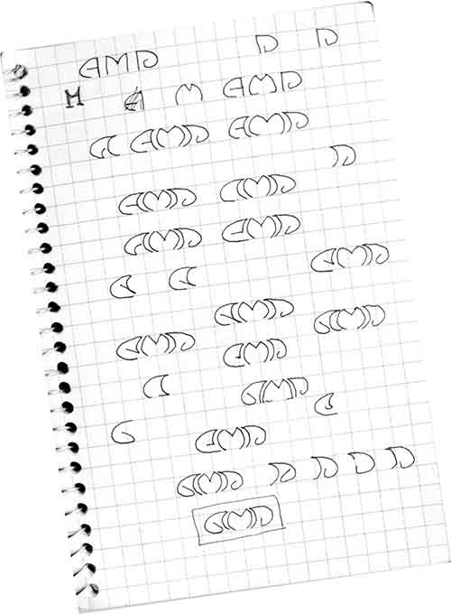 L'histoire le dira, mais l'histoire continue, le voyage continue, et en cet automne austral débutant, esthétisé de coloris fauves et rutilants, je dépose très vite mes semelles dans une bourgade noyée d'araucarias (que je nommerai plus tard, et avec fierté, mon paradis perdu) : Caviahue. Perché sur les modestes flans de la Cordillère patagonique, coincé entre le lac du même nom et son volcan Copahue (qui entre en éruption tous les dix ans), Caviahue est un village d'à peine quatre cents habitants, et c'est dans le Refuge « del Caniche », en compagnie de Ruben, Patricia, Federico, Gérald, Marcelo, Leo, Sergio... amis pour toujours, que je vais passer quinze jours inoubliables, quinze jours formidables, rompant ainsi la stéréotypie de mon vagabondage qui dure déjà depuis près de sept mois. Durant cette quinzaine, où flânerie et activités manuelles se côtoieront à merveille, je dessinerai très peu, mais un soir, surement suite à une journée d'effort haletant, où toute la tribu semblait perdue dans son repos méditatif, je sortis mon petit carnet quadrillé et me mis à gribouiller trois lettres, à les agencer de manière à former une capsule : trois lettres, AMP, les trois premières du mot amphétamine. J'ai été pris de beaucoup de délires durant ce voyage, mais à l'heure où j'écris ces mots, soit treize ans après, je suis incapable de savoir pour quelle raison je me suis fait, en ce soir-là, designer de logo. Ce qui est clair, c'est que j'utiliserai ce design, bien plus tard, pour créer l'effigie qui sera la signature présente sur tous mes sites jonchant la toile.