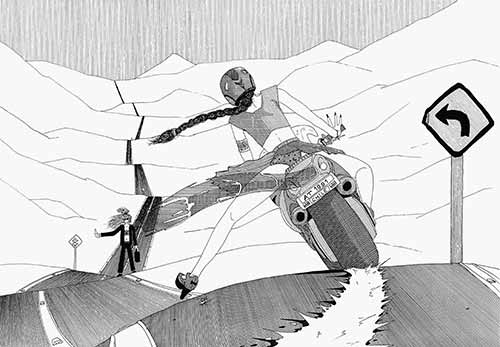 Donc je me répète, tout ceci se fait en parallèle à l'écriture du bouquin, ou plutôt à sa finalisation. Mais durant cette folle année épistolaire qu'est 2001, je dessine aussi, comme toujours, et je me planche plus particulièrement à mettre en image des visions qui m'étaient survenues lors de mon périple sud-américain. Perdu dans l'immensité du désert d'Atacama, au Chili, entouré d'un néant éternel où seul le Licancabur ose s'ériger, je dresse mon pousse le long de cette trainée asphaltée, lourde et pesante sous le soleil de midi. J'imagine alors une mise en scène, qui me restera tous ces mois durant, et que j'esquisserai sur format A3 dès mon retour en France. Le macadam s'étire jusqu'à l'horizon et cisaille l'étendue infertile et opalescente; une personne fait du stop, une femme, vêtue de noir et cheveux au vent, mais le port de ses petites lunettes rondes ne trompe pas: c'est bien moi qui suis planté dans ce néant. Surgit alors un motard, du même genre, tresse et jupe enfiévrées par la vitesse. La trace sur le bitume et la nitescence ondulante du feu stop prouve qu'il va s'arrêter et l'arabesque de sa jupe nous dévoile alors sa petite culotte parsemée de granules. L'amphétamine, toujours présente, s'insinue de manière très furtive dans cette illustration, que je nommerai « Suerte », autant pour justifier mon tracé que ma propre signature. Car je ne signe jamais mes œuvres, étant persuadé qu'elles contiennent des éléments qui ne sont propres qu'à moi et à moi seul. L'amphétamine tout comme les lunettes font partie de ses éléments.
