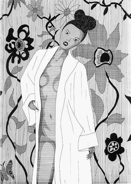 Plusieurs esquisses seront élaborées en relation directe à ce voyage, telle que celle qui m'était survenue à Ushuaia où, repensant à une chanson de Shelby: « un + un » et à leur tirade « la terre tourne comme une orange amère... », il m'était venu en tête une gymnaste jouant avec notre globe terrestre. J'avais alors délinée ces mots: « la terre tourne comme une boule de GRS... ». Il y aura aussi cette hippy, toujours très peu vêtue, lunette noire sur le nez, sac à dos rudimentaire à ses côtés, avachie sur un trottoir et qui venait tout juste de peindre, sur un mur de briques décidément trop propre, les deux kanji du mot existence: SEIZON. Il y aura aussi, mais là ça n'a plus rien à voir avec ce périple passé, cette japonaise, en kimono, placée devant un rideau bariolé de fleurs. Ici aussi, le tracé des lignes parallèles me demanda du temps, surtout que je voulais que tout soit tramé afin de faire ressortir la candeur du peignoir. L'une des fleurs, qui se dresse sur sa droite, révèle alors, telle une image d’Épinal, des pétales en forme de lettres, les premières du mot amphétamine. Si les comprimés ne s'exhibent pas de manière évidente, ils dénotent leur présence aux travers de paraboles qui finissent toujours par bigarrer mes œuvres.