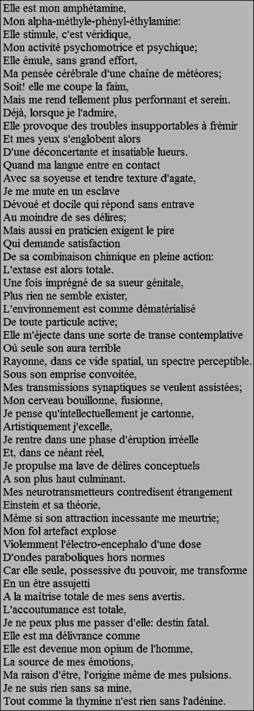 Donc de nouveau, de part ce jeu de rime, nous nous retrouvons face à une autre question, ou plutôt face à la même question: « qui est amphétamine? » Cette capsule rouge et blanche capable de nous élever intellectuellement et artistiquement? ou l'être aimé, tout aussi capable de ceci? En fait les deux, ça va de soit, mais aux travers de ce poèmes, je rédigeais, instinctivement, la transition de mon Récit: L'amour de l'être aimé est une drogue qui très souvent détruit (les confessions sur ce thème ne manquent pas), mais plus que tout, c'est une drogue qui enivre, qui libère, qui propulse nos possibilités vers des horizons lointains et inconnus mais aussi hostiles et interdits, à l'instar de l'amphétamine. Et c'est cet interdit, que je finis par m'interdire, qui allait libérer ma conscience de ce duel permanent et immanent. En effet, si l'amphétamine est cérébrale, l'être aimé, lui, en cardiaque.