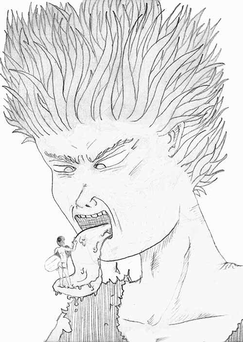 1996, En plein mois de décembre, je me trouve face à une feuille blanche, et commence à crayonner. Deux heures plus tard, une esquisse magistrale s'offre à moi. Entre les deux, aucun souvenir, aucun rappel, aucune impression : une amnésie irréprochable. C'était comme si ma main droite, durant ce laps de temps, s'était mise à bouger toute seule, à noircir la planche sans contrôle aucun, comme emporter par l'emballement synaptique. Ce dessin, que j'offrirai quelques jours plus tard à ma cousine pour Noël, marque une date butoir dans ma vie. Car même si on y reconnaît un semblant de Tetsuo, des édifices Neo-Tokyoite, le tout baigné dans un style « Otomesque », jamais je ne revivrais une telle expérience où mon poignet s'était mis à bouger tout seul, ne se soumettant à aucune de mes volontés. L'extase fut d'autant plus forte que cette image, issue de l'inconscient le plus sagace, à l'angle supérieur vide d'un optimisme en gestation, transfigure, de façon évidente, l'essence même de ma pensée : la beauté de la vie humaine face à l'insignifiance du dégât matériel, ou mieux encore, de sa possession.